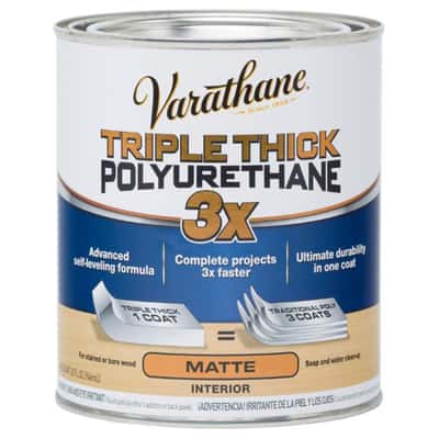 Rust-Oleum 302736 Triple Thick Polyurethane Matte 32 oz Clear. This water-based formula provides excellent scratch and stain resistance. Provides long-lasting beauty and protection to any interior wood surface. It is an advanced self leveling formula that allows projects to be completed in one coat. Ideal for woodwork furniture doors cabinets and floors. Easily protects and adds beauty to interior wood surfaces including woodwork furniture doors and cabinets. Varathane 318289 Spray Triple Thick Polyurethane 1125 oz Matte.