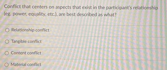 Relationship conflict is best described as conflict about:. Conflict between coworkers on the production line can be expensive as well as time consuming for companies. 1 1 pts Question 8 Task conflict is best described as. D Two people adopt a win-win rather than a win-lose orientation.