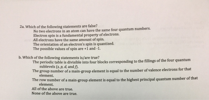 Which of the following statements best describes the quantum property spin?. Which of the following statements best describes the quantum property spin. The two values of the spin quantum number allow each orbital to hold two electrons. Which Of The Following Statements About Quantum Numbers Is TRUE.