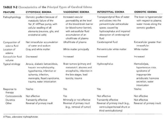 Patients with glioblastoma commonly develop vasogenic edema. Osmotic therapy is the mainstay of treatment for cerebral edema. In patients with swollen supratentorial hemispheric ischemic stroke routine intracranial pressure monitoring or cerebrospinal fluid diversion is not indicated but in patients who continue to.