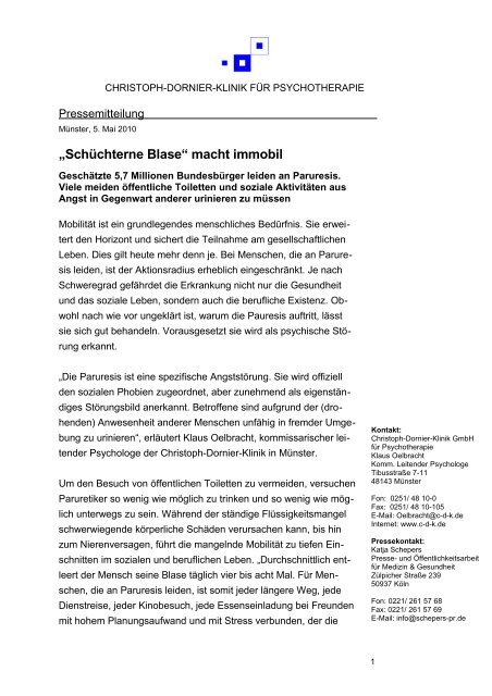 So entwickelt sich ein positiv besetztes Mantra welches beim Besuch von öffentlichen Toiletten die Betroffenen stärkt die Situation zu überwinden. Der erste Schritt sollte sein die Phobie als solche anzunehmen und Informationen darüber zu sammeln. Konkret bedeutet das. Etwa 57 Millionen Menschen haben Probleme zu. Er sorgt dafür dass der Speichermuskel sich zusammenzieht und die beiden Schließmuskeln sich öffnen. Für die Entleerung der Blase muss der Ruhenerv der Parasympathikus aktiv werden. Angst und Stress führen zu einer Aktivierung des Sympathikus. Patienten mit prall gefüllter Blase besuchen an der Seite des Therapeuten ein öffentliches Urinal und bleiben so lange davor. So entwickelt sich ein positiv besetztes Mantra welches beim Besuch von öffentlichen Toiletten die Betroffenen stärkt die Situation zu überwinden.