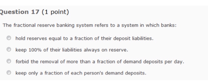 In a fractional reserve banking system banks keep a fraction of deposits as reserves and use the rest to make loans. Only works if there are a limited number of banks c. Fractional reserve banking is a banking system in which banks only hold a fraction of the money their customers deposit as reserves.
