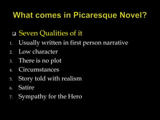 First picaresque novel. Picaresque novels typically adopt a realistic style. There are often some elements of comedy and satire. The story is told with elements of realism.